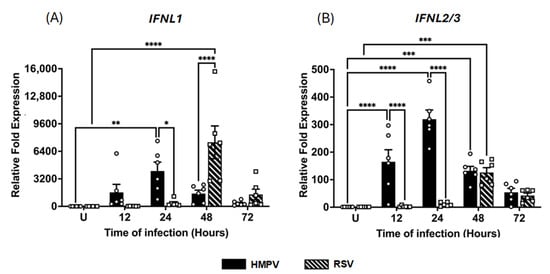 IFN-III response induced in macrophages by RSV and HMPV infection. MDMs were infected with HMPV or RSV at an MOI of 1.0. Cell lysates were collected at 12, 24, 48, and 72 h after infection and analyzed by RT-qPCR to determine expression amounts of (A) IFN-λ1 (IFNL1) and (B) IFN-λ2/3 (IFNL2/3). The bar graphs with scatter plots represent the mean ± SEM (n = 6). U = uninfected control cells. Statistical differences were calculated using ordinary two-way ANOVA followed by a Šidák multiple comparison test. * p < 0.05, ** p < 0.01, *** p <0.001, **** p < 0.0001.