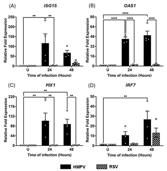 ISG induction in HMPV- and RSV-infected macrophages. MDMs were infected with HMPV or RSV at an MOI of 1.0 Cell lysates were collected at 24 and 48 h for analysis by RT-qPCR to determine gene expressions of (A) ISG15, (B) OAS1, (C) MX1, and (D) IRF7. The bar graphs with scatter plots represent the mean ± SEM (n = 4). U = uninfected control cells. Statistical differences were calculated using ordinary two-way ANOVA followed by a Šidák multiple comparison test. ** p < 0.01, **** p < 0.0001.
