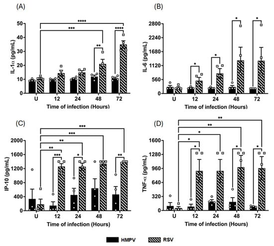 Cytokine release from HMPV- or RSV-infected macrophages. MDMs were infected with HMPV or RSV at an MOI of 1.0. Cell-free supernatants were collected at 12, 24, 48, and 72 h, and concentrations of (A) IL-1α, (B) IL-6, (C) IP-10, and (D) TNF-α were determined for analysis using VeriPlex Human Interferon 9-Plex. The bar graphs with scatter plots represent the mean ± SEM (n = 4). U = uninfected control cells. Statistical differences were calculated using ordinary two-way ANOVA followed by a Šidák multiple comparison test. * p < 0.05, ** p < 0.01, *** p < 0.001, **** p < 0.0001.