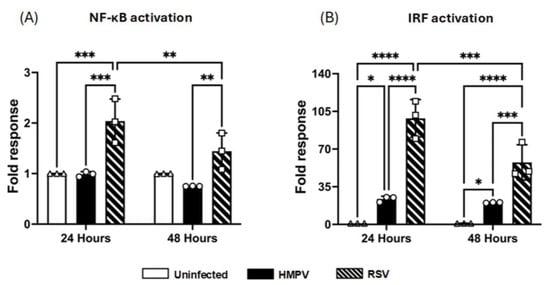 Based on the above observations in which RSV-infected MDMs secreted higher levels of inflammatory cytokines, but HMPV infection was associated with stronger IFN production, we then analyzed the activation of key transcription factors such as NF-κB and IRFs that control the expression of cytokines. Specifically, NF-κB plays a central role in the induction of proinflammatory cytokines such as IL-1α, IL-6, IP-10, and TNF-α, while IRFs are critical for the transcription of IFNs and ISGs. We used macrophages derived from the THP1-Dual cell line, which express two reporter systems to identify the activation of both transcription factor families, including the secreted alkaline phosphatase (SEAP) as a readout for NF-κB activation and Lucia luciferase, which is expressed under an IRF-inducible promoter to monitor IRF activity, including IRF1, IRF3, IRF5, and IRF7. THP-1-derived macrophages were infected with RSV or HMPV at an MOI of 1.0. After infection, cell-free supernatants were collected at 24 and 48 h for their analysis. Our results demonstrated that RSV infection led to a significantly higher SEAP response at 24 h after infection than uninfected control cells, indicating significant NF-kB activation. This activation pattern persisted at 48 h, supporting the finding that RSV strongly activates proinflammatory signaling pathways. On the other hand, HMPV did not induce an activation of NF-κB in the infected cells (Figure 6A). Data analysis of the luciferase response indicates that RSV induced strong IRF activation (98 ± 6.4-fold over the uninfected control) at 24 h after infection and remained high (57 ± 6.0-fold) at the 48 h time point. Regarding HMPV, it also induced IRF activation. However, the response was weaker than that induced by RSV, observing an approximate 23 ± 0.9-fold response at 24 h, which was sustained at 48 h (Figure 6B). Overall, these data suggest that RSV activates both NF-κB and IRF transcription factors, while HMPV activates mostly the IRF signaling in the infected macrophages.