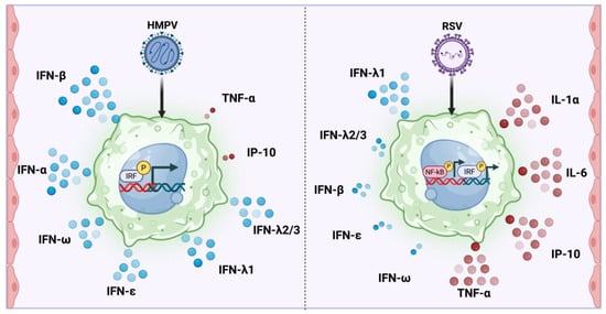 Based on the overall results, the differential activations of the antiviral and proinflammatory responses of macrophages to RSV and HMPV infection are summarized in Figure 7.