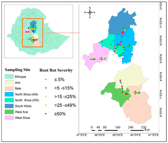 The survey of faba bean root diseases and soil sampling was conducted in 2021 during the main cropping season across 150 random faba bean and pulse cropping zones of the Amhara (South Wollo, North Shoa) and Oromia (West Shoa, Arsi, West Arsi, Bale, and North Shoa) regions, which include mid to extreme highlands across the geographical zones of Ethiopia. These zones typically have a bimodal rainfall distribution and high-altitude climatic conditions (Table 1). A map highlighting the study areas and sites sampled is shown in Figure 1. Of the 150 faba bean and pulse crop sites, 126 were associated with faba bean crops, 18 with field pea (Pisum sativum) crops, and 6 with lentil (Lens culinaris) crops.