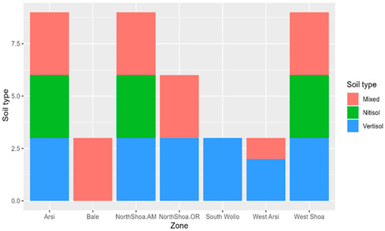 The farms situated in the different geographical zones had varying soil types, including 55 farms with vertisol (black soil), 63 farms having mixed soil (humus rich soil), and 32 farms with nitisols (reddish soil) across the different geographical zones. The dominant soil type in the study area was vertisol, which was present in most zones except Bale, where mixed soil was the only soil type. Vertisol was the only soil type in South Wollo. The zones lacking nitisol soils included North Shoa Oromia, Bale South Wollo, and West Arsi (Figure 2).