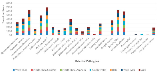Distribution of identified soilborne pathogens across the different geographical zones. Note: Their ‘pooled incidence across different zones’ represents the total summation of the individual incidence in each zone for each pathogen.