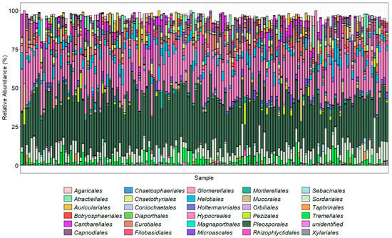 Using ITS2 primers, the top 30 most abundant orders in each sample as a percentage of that sample. Colors generally follow the order of the legend; for example, Agaricales is at the top of the stacked column and Xylariales at the bottom.