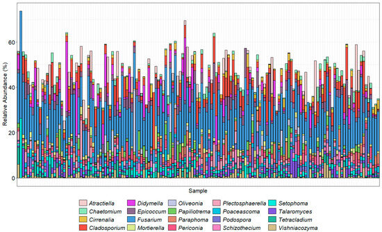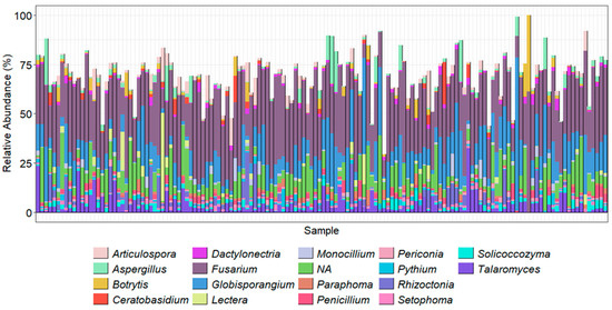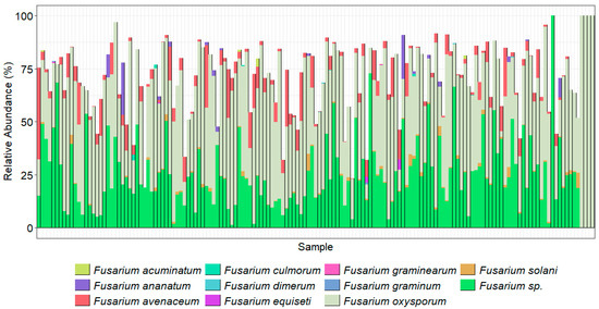 The bar charts display the predominant taxa in the samples as a percentage of the total for the top 30 most abundant orders (Figure 4) and the top 20 most abundant genera (Figure 5) found using the ITS2 primers. The TEF1α primers were designed to bias the amplification for Fusarium spp.; however, they are degenerate primers and amplify other fungal taxa with varied efficiencies. Here, we show the Fusarium spp. identified using our taxonomic assignment methods. The taxonomic assignment was further clarified where possible by alignment of these sequences with those downloaded from Fusarium-ID v.3.0 [40]. Some sequences, however, were not present in this database. Neither the ITS2 nor TEF1α gene regions provide enough resolution to confidently separate the formae speciales. Amplicons prepared with the primer ITS1Oo [41], which generated 7.8 million sequences that were reduced to 3.2 million (with an average 21,600 sequence per sample), with a mean read length of 245 bp.