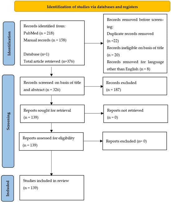 A literature search was conducted in PubMed. Systematic reviews, meta-analyses, original articles, and reviews were screened from this database between 2004 and 2024. The following set of keywords was used in combination to retrieve these articles: HEV, Hepatitis E, non-A, non-B, epidemiology, blood donor, food, wastewater, drinking water, and agriculture (Table 1). Only documents published in English with an abstract and full text were used. Articles were excluded based on their title and abstracts or considered irrelevant to this review or related to similar subjects. For manual records, additional keywords such as “one health” and “Africa” were used. For completeness, additional relevant articles have been included, mainly those relating to rat HEV, which is now an emerging cause of hepatitis E infection. The search process is summarized in Figure 1 as a flowchart generated according to the Preferred Reporting Items for Systematic Reviews and Meta-Analysis (PRISMA) guidelines. This systematic review was registered in PROSPERO 2025 CRD420251071192 and is available from https://www.crd.york.ac.uk/PROSPERO/view/CRD420251071192 (accessed on 11 June 2025).