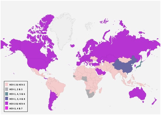 Eight genotypes have been identified in the P. balayani species, five of which are reported to cause human disease [,]. HEV-1 and HEV-2 genotypes are widely dis-tributed. These strains are pathogenic only for humans and are endemic in developing countries where they are responsible for significant waterborne outbreaks in endemic regions of Africa, South and Southeast Asia, and Mexico [,]. HEV genotypes 3 and 4 (HEV-3 and HEV-4) are zoonotic strains with animal reservoirs, and a broad host range is known (pigs, cattle, sheep, goats, horses, macaques, cats, dogs, rabbits, mongoose, rats, and mice) and they have a geographical spread around the world. These genotypes of zoonotic HEV cause sporadic and cluster cases in both industrialized and developing countries [,,,]. Furthermore, local outbreaks caused by HEV-3 and 4 have been reported [,,,,]. They can be transmitted to humans mainly through consuming contaminated foodstuffs, including raw and undercooked meat products from the animals mentioned above, because they circulate in both domestic and wild fauna. In addition to the zoonotic transmission route, many studies reported that these genotypes could also be transmitted parenterally via blood and blood products [,,,]. Two unrecognized and different new genotypes were isolated from Japanese wild boar for the first time and identified as genotypes 5 and 6 [,]. In addition to these, two additional HEV genotypes have been identified in dromedaries (DcHEV) and camels (BcHEV), respectively, HEV-7 and HEV-8, further expanding the host diversity of HEV [,,]. These camel HEV genomes possessed >20% nucleotide difference from all other HEVs with complete genome sequences available []. HEV-7 is likely to be a causative agent for human hepatitis E infection and has been identified in a man who regularly consumed camel meat and milk [,,,]. It is important to note that HEV-7 and HEV-8 genotypes were identified in the Middle East and China, respectively. However, the knowledge and geographical distribution of these genotypes remain limited compared to the other genotypes. Figure 2 shows the global distribution of P. balayani genotypes and their overlaps in specific geographical areas.