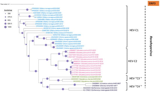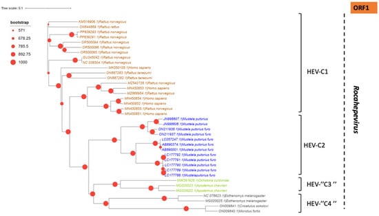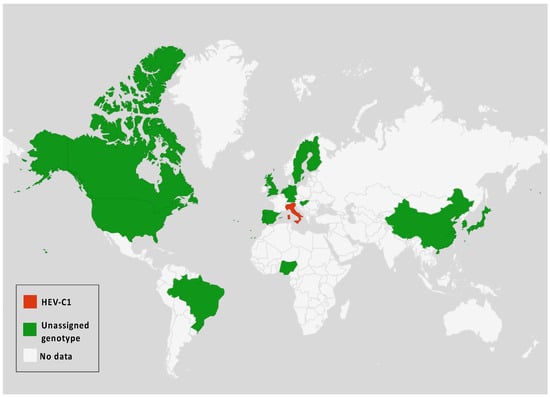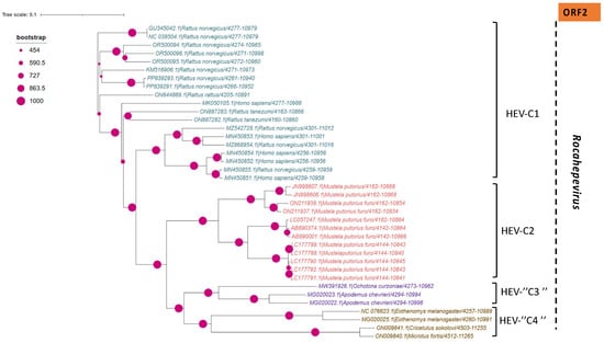 In addition to the common Paslahepevirus balayani strains causing hepatitis E infections in humans, an emerging HEV species, Rocahepevirus ratti (classified initially as Orthohepevirus C), which is genetically very different, has been identified primarily in rats (Rat-HEV) and other rodents (shrews, ferrets, minks, and wild rodents) []. This species has only 50–60% genomic identity and a significant ORF2 sequence divergence compared to P. balayani. Its intra-species diversity shows two main genotypes known as HEV-C1 and HEV-C2, with rodents and carnivores as their respective hosts. Rat HEV strains primarily infect rats but have also been identified as capable of crossing the species barrier and infecting humans, thus presenting a potential risk of zoonotic transmission. However, although HEV-C1 is most frequently involved in human infections, the C1 genotype predominantly comes from rats, while C2 strains originate from ferrets and minks. In addition, two other putative genotypes have been proposed to date, namely C3 and C4 [], but have yet to be assigned (Figure 3).