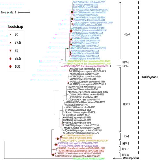The major HEV strain infecting humans is classified in the genus Paslahepevirus, belonging to the family Hepeviridae, subfamily Orthohepevirinae [], and can be further divided into two species: Paslahepevirus balayani (formerly known as Orthohepevirus A) and Paslahepevirus alci [,].