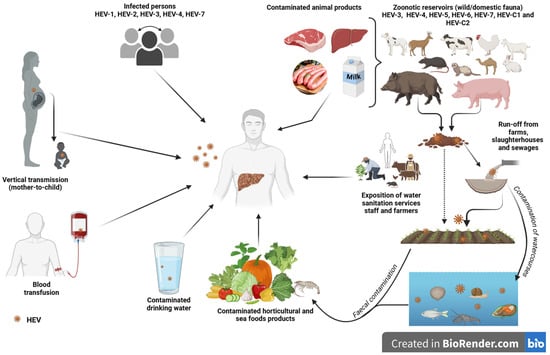 Different transmission routes of hepatitis E virus (created with BioRender.com, accessed on 27 June 2024).