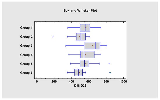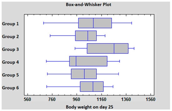 The individual body weight data are shown in Tables S1–S6. The group average body weight data are summarized in Table 5. Based on the statistical analysis on D18, there was a significant difference between the body weight of Groups 1, 3 and 6 compared to Groups 4 and 5. On D25 the body weight of Groups 3 and 6 was significantly higher compared to Group 2. The statistical analysis of D25 data is presented in Figure 1.