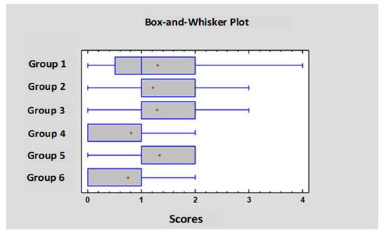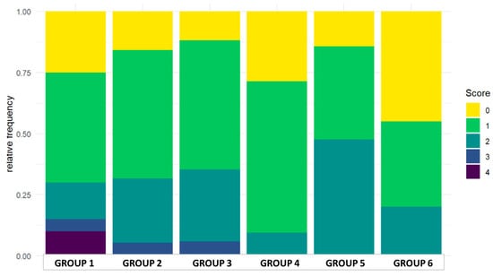 On day 25 the small intestine of the chickens was evaluated according to the scoring system described in Table 3. Scores between the range of 0 and 4 were found in the experiment; more severe pathological findings (scores 5 or 6) were not observed. Individual and group average data are shown in Tables S7, S8 and Table 7. Statistical analysis of the scores is shown in Figure 3. The occurrence of the different scores is summarized in Figure 4. Representative photos of the different scores are shown in Figure 5. The scores in Group 6 were significantly lower than those of Groups 1 and 5. In addition, in Group 4 the scores were significantly lower compared to Group 5.