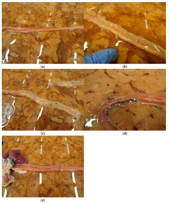 Representative small intestinal scores (a) score 0, (b) score 1, (c) score 2, (d) score 3, (e) score 4.