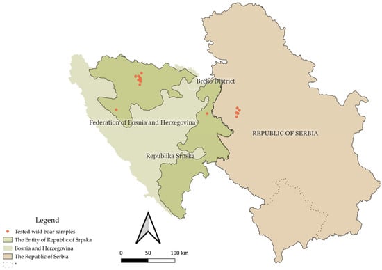 Viral diseases in wild boars have been the focus of several studies in Serbia. High prevalence rates of PCV2 have been reported, reaching up to 69.9%, while PRV has been detected in 18–20% of tested animals [3,14,15]. PCMV was identified in a study by Jezdimirović et al., with a reported prevalence of 4.8% [14]. Pestiviruses have also been found in wild boar populations, with APPV last detected in 2015 [16]. As for CSF, the most recent case in Serbia occurred in 2010 [17]. Following that, a strict vaccination campaign was launched, and no new cases have been reported in the past decade. ASF has been present in the wild boar population in Serbia since 2020, with new cases reported each year. Both the number of outbreaks in wild boars and the incidence in domestic pigs have continued to rise annually [18]. In Bosnia and Herzegovina, specifically in the Republic of Srpska, there are no studies concerning viral diseases in wild boar. The presence of PRV has been confirmed indirectly through infections in hunting dogs [19]. To date, there have been no reports of PCMV or APPV in the region. CSF has not been detected for a decade, largely due to strict vaccination protocols implemented in domestic pig populations [20]. ASF, however, was first reported in 2023, and the number of cases has been steadily increasing since [21]. In both Serbia and the Republic of Srpska, active and passive surveillance programs are in place for the detection of ASF and CSF in dead or diseased wild boars. In Serbia, passive serological surveillance for PRV is also conducted using a subset of samples originally collected for ASF and CSF monitoring. However, the presence of other viral pathogens in wild boar populations, such as PCV2, PPV, APPV, or PCMV, is not currently addressed under official government surveillance or legislative frameworks [22]. Previous studies on PPV, PCV2, and PCMV in Serbia have primarily focused on the eastern parts of the country, with little to no information available from regions bordering the Republic of Srpska [3,14,23]. These bordering areas are of particular interest, given their geographical continuity and the frequent movement of wildlife across national boundaries. Despite the recognized role of wild boars as reservoirs and potential vectors of viral pathogens, recent data on their infection status in the Republic of Srpska are lacking. This limits our understanding of the epizootiological situation in this shared ecosystem and the potential risks it poses to domestic pig populations. The aim of this study is to assess the prevalence and spatial distribution of selected viral pathogens in wild boar populations in Serbia and the Republic of Srpska (Bosnia and Herzegovina). By generating updated data and exploring co-infection patterns, the study seeks to contribute to a better understanding of pathogen dynamics at the wildlife-livestock interface. These insights are crucial for designing effective disease surveillance, prevention, and control strategies, particularly in regions where backyard farming and low biosecurity increase the risk of disease spillover.