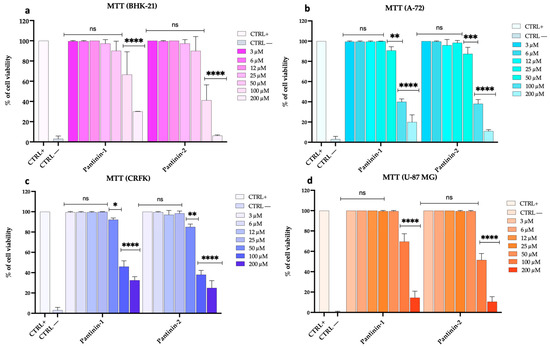 We conducted a comprehensive analysis to assess the potential cytotoxic effects of pantinin-1 and pantinin-2 on various animal and human cell lines, including BHK-21, A-72, CRFK, and U-87 MG cells, via the MTT assay (Figure 1).