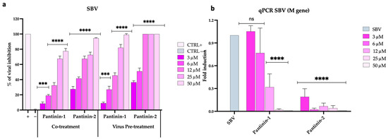 Antiviral activity of pantinins during SBV infection in BHK-21 cells. (a) Evaluation of antiviral activity using the TCID50 method in co-treatment and virus pre-treatment assays. Oreoch-1 peptide was used as a positive control (CTRL+), and infected cells were used as a negative control (CTRL−). (b) Quantitative real-time PCR investigation of M gene expression following virus pre-treatment with pantinin-1 and pantinin-2. Two-way ANOVA with Dunnett’s multiple comparisons test was performed. **** p < 0.0001, *** p < 0.0002, and ns = not significant.