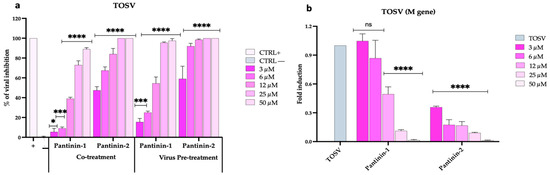 We then extended the evaluation of the antiviral activity of pantinins against TOSV using a broad panel of both animal and human cell lines. First, we assessed the effect of pantinins in the BHK-21 cell monolayers (Figure 3), an established in vitro model commonly used to culture TOSV [44,45], in co-treatment and virus pre-treatment conditions, and by qPCR.