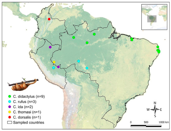 Map showing a partial representation of South America indicating the locations where animals were sampled. Circles represent the different sampled species according to their capture sites. Black lines represent the borders of the sampled countries (Brazil, Peru, and Colombia). Illustration of C. didactylus by Eisenberg and Redford [8]. The map was generated using QGIS (v. 3.32.0, 2023) with WGS-84 as the geographic reference system [20].