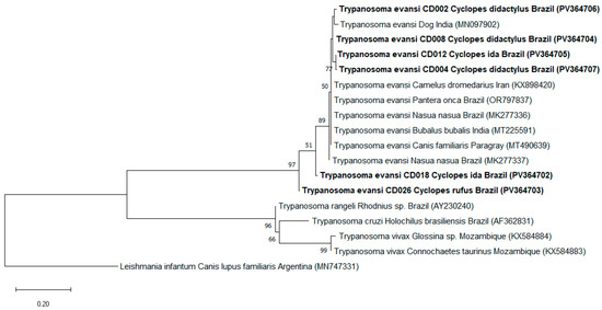 All 16 DNA samples analyzed tested positive for the mammalian endogenous gene (gapdh). Subsequent molecular tests detected the presence of T. evansi (ITS-1 gene) in 50% (8/16) of the analyzed samples, including six samples from Brazil (four C. didactylus, one C. thomasi, and one C. rufus) and two from Peru (two C. ida). All eight samples were also positive for the amplification of the 18S rRNA gene of Kinetoplastida. Positive samples were subjected to genetic sequencing; however, only six ITS gene products yielded readable sequences (GenBank accession numbers: PV364702 to PV364707). BLASTn analyses showed percent identity ranging from 92% to 98.6% with T. evansi sequences from different hosts, including N. nasua (MK277343; MK277341) from Brazil, camel (Camelus spp. Linnaeus, 1758) (MH595480) from Iraq, and water buffalo (Bubalus bubalis Linnaeus, 1758) (MT225591) from India. Moreover, the maximum likelihood (ML) analysis based on the ITS-1 gene (219 bp), using the Jukes–Cantor (JC) model, clustered the T. evansi sequences detected in this study with sequences of the species sampled from C. familiaris, Camelus dromedarius, Panthera onca Linnaeus, 1758, N. nasua, and B. bubalis collected in India, Iran, Brazil, and Paraguay (Figure 2).