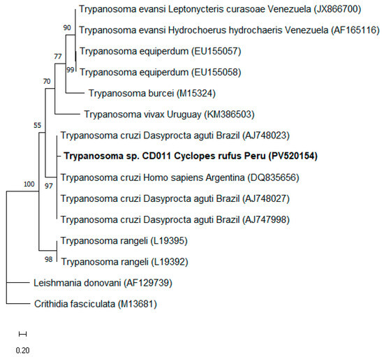 Additionally, 6.2% (1/16) of the individuals analyzed, represented by one specimen of C. rufus from Peru, tested positive for T. cruzi/T. rangeli (kDNA gene). Genetic sequencing of the amplified fragment (accession PV520154) revealed 87.6% identity with T. cruzi sequences previously isolated from agouti (Dasyprocta aguti Linnaeus, 1766) (AJ748023, AJ748027, AJ747998) and Homo sapiens Linnaeus, 1758 (DQ835656), from Brazil and Argentina, respectively. The sequencing reaction was performed in triplicate using both forward and reverse primers, and the resulting electropherograms were used to generate a consensus sequence, which consistently yielded similar identity values across all replicates. Pairwise alignment with the reference sequence AJ748023 showed 41 nucleotide differences over 329 base pairs (query cover 96%), supporting the calculated identity percentage. This same sample also tested positive for the 18S rRNA and kDNA genes of Kinetoplastida; however, the sequences obtained were not considered of sufficient quality for conclusive analyses. Phylogenetic inference performed using ML, based on kDNA gene sequences (307 bp) and the Tamura three-parameter (T92) substitution model, consistently clustered the Trypanosoma sp. sequence detected in this study within the same clade as T. cruzi sequences obtained from different hosts in Brazil and Argentina (Figure 3). Although the sequence clustered robustly with T. cruzi (bootstrap = 97%), it was conservatively labeled as Trypanosoma sp. in the phylogenetic tree due to the moderate identity value and relatively short fragment length. This clustering showed high statistical support, indicating a robust evolutionary relationship between the sequence obtained and previously described T. cruzi strains.