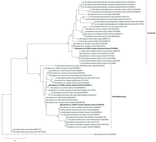 The screening PCR based on the 16S rRNA gene (600 and 193 bp) of hemoplasmas revealed a positivity rate of 62.5% (10/16), including seven individuals from Brazil (five C. didactylus, one C. rufus, and one C. thomasi) and three from Peru (one C. rufus and two C. ida). Additionally, 5 out of the 10 samples positive for the 16S rRNA gene were also positive for the 23S rRNA gene (800 bp) (4 C. didactylus from Brazil and 1 C. ida from Peru). PCR products with strong band intensity were selected for genetic sequencing; however, satisfactory results were obtained for only three 16S rRNA gene sequences (accessions PV530210, PV530211, PV535592). BLASTn analyses revealed high identity between one of the obtained sequences (CD005) and hemotropic Mycoplasma sp. previously detected in arboreal Neotropical primates of the genus Alouatta spp. Lacépède, 1799, in Brazil (KT824793, JQ897386, MH734376, MH734374), with percentage identity ranging from 97.7% to 98.5%. Furthermore, this sequence showed 95.4% to 96.1% identity with ‘Candidatus Mycoplasma kahanei’, previously described in Saimiri sciureus Linnaeus, 1758, another arboreal primate from Brazil (JQ897388) and the United States (AF338269). Another sequence (CD006) showed 99.4% to 99.8% identity with Mycoplasma sp. and ‘Ca. Mycoplasma haemobos’, previously detected in giant anteater (Myrmecophaga tridactyla Linnaeus, 1758) (OR469807) from Brazil and bovids (MG948628, MG948630, MG948631) sampled in Central America. The third and final readable sequence analyzed (CD008) showed 97.9% to 98.4% identity with Mycoplasma sp. isolated from Coendou villosus Coendou Lacépède, 1799, in Brazil (MN860071) and Mycoplasma lineages detected in Lycalopex griseus Gray, 1837 (MK064160), wild felids (MN543637), and wild rodents (KT215636). Phylogenetic inference performed using ML, based on the 16S rRNA gene and the Tamura three-parameter model with gamma distribution (T92+G), grouped the Mycoplasma spp. sequences detected in this study into two main clades, which, according to the authors of [52], can be divided into the haemofelis group (n = 2) and the suis group (n = 1), both supported by high bootstrap values. One sample from the suis group (CD005) clustered within the same clade as hemoplasmas previously detected in arboreal primates, with phylogenetic proximity to the ‘Ca. Mycoplasma kahanei’ clade. Of the two samples grouped in the haemofelis group, one (CD006) showed high similarity with Mycoplasma sequences isolated from M. tridactyla, both positioned within the same clade as ‘Ca. Mycoplasma haemobos’. Meanwhile, sample CD008 showed a closer phylogenetic relationship to Mycoplasma spp. detected in C. villosus, a Brazilian mammal that also has arboreal habits (Figure 4).
