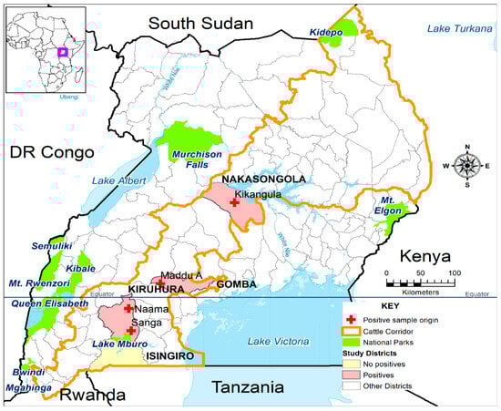 APA StyleArinaitwe, E., Waters, K., Faburay, B., Nakanjako, G. K., Atuhaire, D. K., Afayoa, M., Mwiine, F. N., & Erume, J. (2025). Detection and Molecular Characterization of Rift Valley Fever Virus in Apparently Healthy Cattle in Uganda. Pathogens, 14(7), 720. https://doi.org/10.3390/pathogens14070720