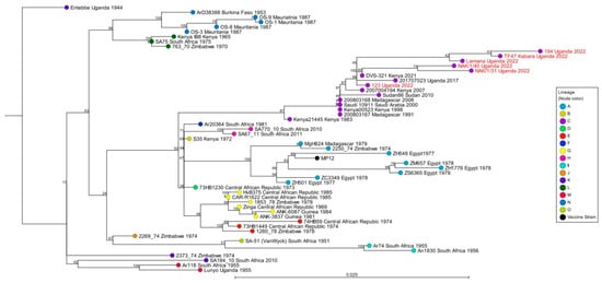 3.3. Phylogenetic Analysis of the S and L Segments of RVFV Samples from Cattle in Uganda