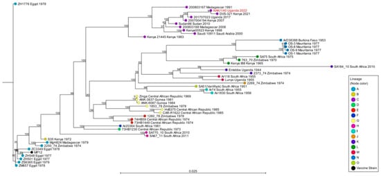 - Onwongá, A.A.; Oyola, S.O.; Juma, J.; Konongoi, S.; Nyamota, R.; Mwangi, R.; Muli, C.; Dobi, P.; Bett, B.B.; Ongus, J.R. Genome characterization of Rift Valley fever virus isolated from cattle, goats and sheep during interepidemic periods in Kenya. BMC Vet. Res. 2024, 20, 376. [Google Scholar] [CrossRef]