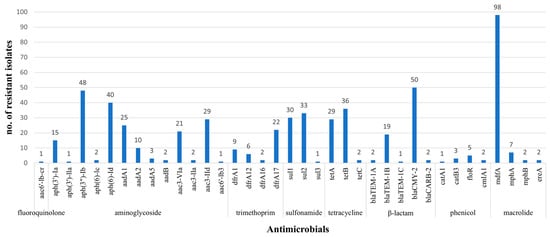 - Zankari, E.; Hasman, H.; Cosentino, S.; Vestergaard, M.; Rasmussen, S.; Lund, O.; Aarestrup, F.M.; Larsen, M.V. Identification of acquired antimicrobial resistance genes. J. Antimicrob. Chemother. 2012, 67, 2640–2644. [Google Scholar] [CrossRef] [PubMed]