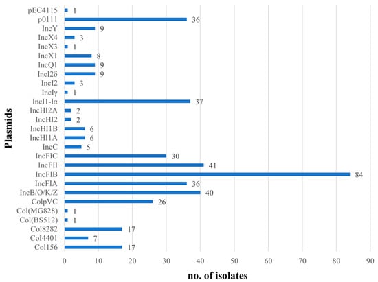- Carattoli, A.; Zankari, E.; García-Fernández, A.; Voldby Larsen, M.; Lund, O.; Villa, L.; Møller Aarestrup, F.; Hasman, H. In silico detection and typing of plasmids using PlasmidFinder and plasmid multilocus sequence typing. Antimicrob. Agents Chemother. 2014, 58, 3895–3903. [Google Scholar] [CrossRef] [PubMed]