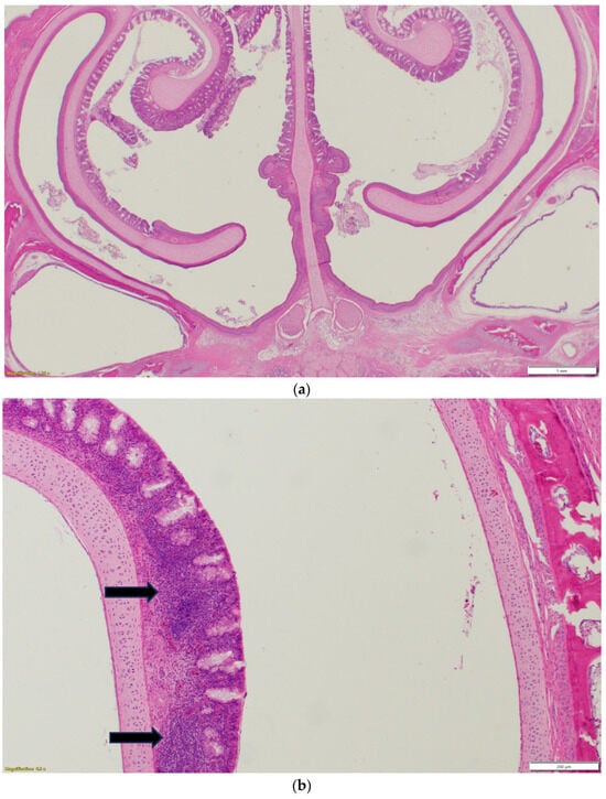 Nasal sinuses (Figure 1a–d), including the nasal turbinate and infraorbital sinus, are scored at two levels: mucosa and submucosa. Respiratory mucosa hyperplasia/metaplasia takes 1 point, while desquamated mucosa within the lumen takes 1 more point. Submucosal lymphocytes take 1 point with a small number of lymphocytes and 2 points if they are too numerous to count (above 100 in one 400X microscopic field). An additional 1 point is added when there is infiltration of heterophils in the submucosa or mucosa. If there is vasculitis in the submucosa, 1 point is counted. The scores of the nasal turbinate and infraorbital sinuses are added to give total nasal sinus scores. Similarly, trachea and eyelids (Figure 1e) are graded considering mucosal hyperplasia/metaplasia, luminal debris, submucosal lymphocytes, heterophils, and vasculitis (1 point each). Lungs (Figure 1f–h) are scored considering hyperplasia in the bronchial associated lymphoid tissue (BALT; 1 point), germinal center formation (1 point), lymphocytic infiltration in air capillaries (1 point or 2 points in more than 100 in one 400X microscopic field), and vasculitis (1 point) (Figure 1a–h). The sum of scores of the nasal sinuses, trachea, lungs, and eyelids forms the value of the histologic respiratory index (HRI) (Table 1).