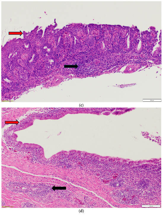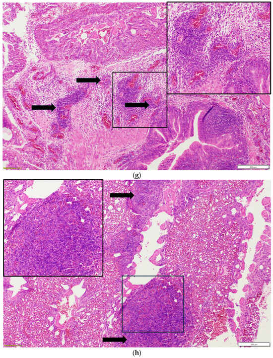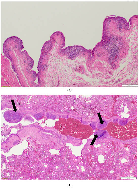 The histopathological changes in the affected tissues provide significant information about the pathogenicity, virulence, tissue tropism, and comparative pathogenicity of various pathogens. This helps understand the dynamics, clinical severity, and mechanism of infection progression []. The histological lesion assessment can also serve as an objective tool, a scoring system, to evaluate the efficacy of vaccines and the development of an integrated challenge model [].