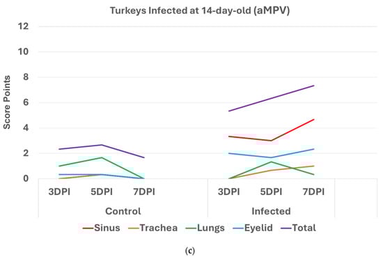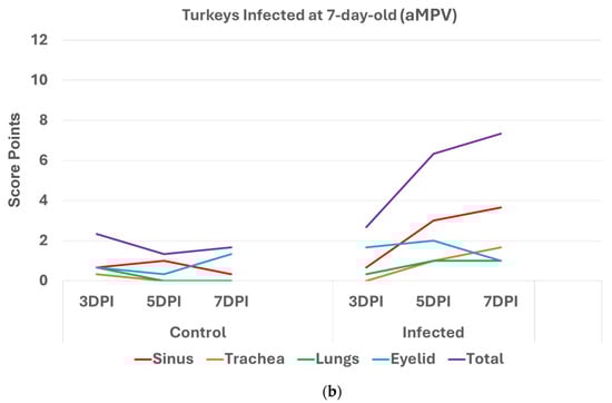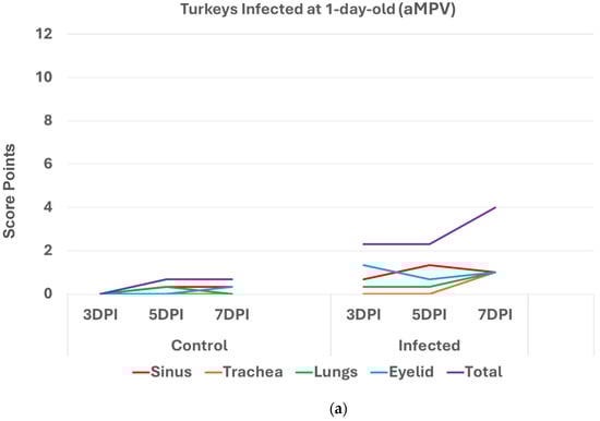 Turkeys inoculated with aMPV at 7 days of age showed statistically significantly higher lesion scores (HRI) (p < 0.05) at 10 DPI compared with the non-infected control group. Sinus and eyelids were the main organs scoring points compared with other organs (Figure 4a).