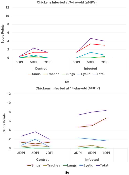 (a). Histologic respiratory index (HRI) at 3, 5, and 7 days post infection (DPI) (3 birds a group per timepoint) in chickens inoculated with aMPV at 7 days old. Total HRI, sinus, and eyelid scores are statistically significantly higher (p < 0.05) in infected birds compared with non-infected controls at 5DPI and 7DPI (Mann–Whitney U Test). (b). Histologic respiratory index (HRI) at 3, 5, and 7 days post infection (DPI) (3 birds a group per timepoint) in chickens inoculated with aMPV at 14 days of age. Total HRI, sinus, and eyelid scores are statistically Significantly higher (p < 0.05) in infected birds compared with non-infected controls at 3DPI, 5DPI, and 7DPI (Mann–Whitney U Test).
