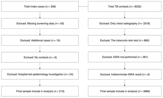 Algorithm for the selection of TB index cases who underwent TB epidemiological investigations and their contacts who were screened for LTBI using IGRA.