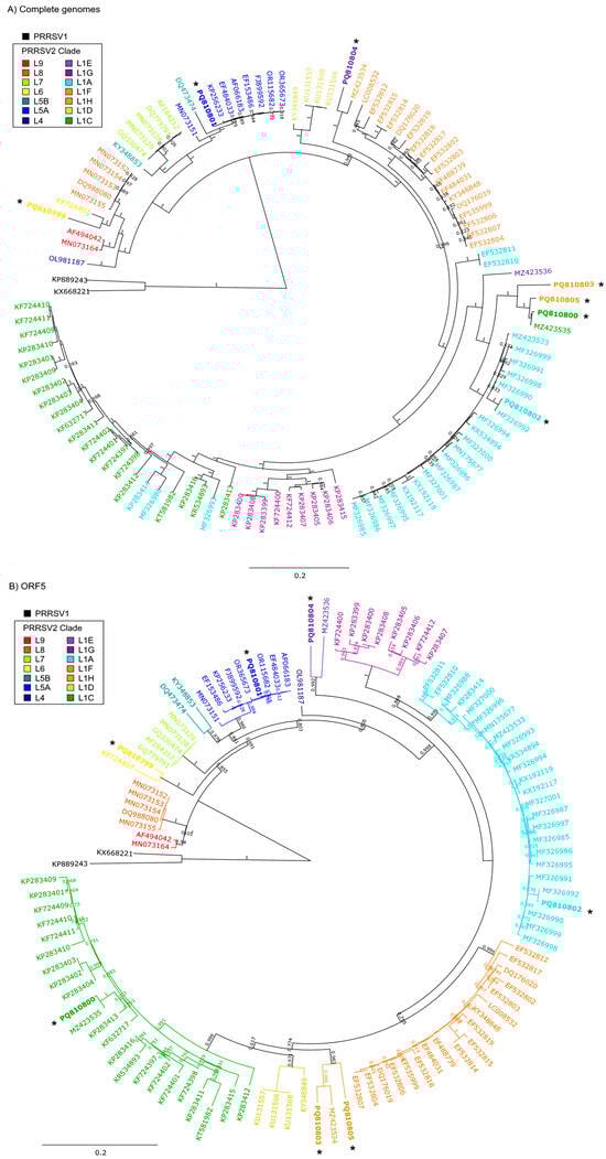 Phylogenetic nucleotide trees of the seven PRRSV isolates as they relate to PRRSV strains constructed from (A) genome sequences and (B) ORF5 sequences. The isolates (*) are labeled using their accession numbers, with the corresponding isolate names as follows: PQ810799 (KS2006-72109), PQ810800 (UIL21-0712), PQ810801 (USA-IL-23295-GA), PQ810802 (USA-IN-65239-GA), PQ810803 (USA-NE-26342-1), PQ810804 (USA-OK-27915-12), and PQ810805 (USA-MN-24-00737-0). The legend colors reflect the PRRSV lineages/sublineages, highlighting the genetic relationships and potential recombination events among the strains. ORF5 lineages/sublineages were assigned based on ORF5 phylogeny using the ISU PRRSView web tool []. The bar represents 2 mutations per 10 nucleotides, while the numbers at the branches in the tree are support values calculated by FastTree.