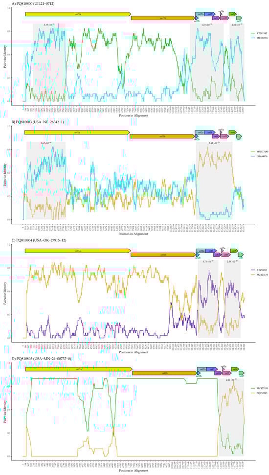 USA-OK-27915-12 (Figure 2C) revealed a predominant genetic contribution from a strain such as MZ423534 (L1H) [], as indicated by the consistently high pairwise identity throughout most of the genome. Two distinct recombinant regions were identified within ORF2 to ORF4 and ORF5 to ORF7, where the pairwise identity shifts to resemble strain KT258003 (L1E), as shown by the increased similarity of the purple line. These findings suggest that USA-OK-27915-12 primarily inherited its genome from L1H, with localized recombination events introducing segments from L1E in the ORF2-ORF4 and ORF5-ORF7 regions.