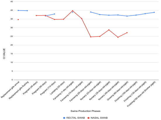 For instance, rectal swabs from asymptomatic pigs had Ct values of 39 (incoming gilts), 37 (114 days gestation), and 38 (150-day finishing pigs).