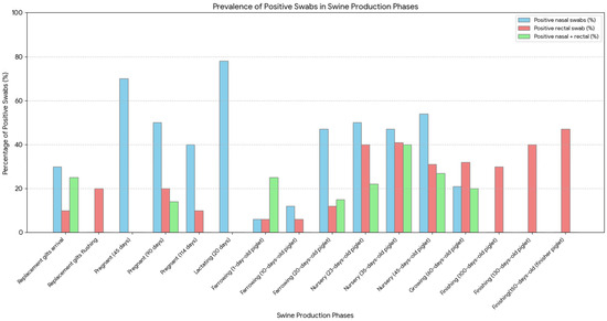 Frequency of Influenza A virus detection across swine production phases, by sample type. Blue bars represent animals positive by nasal swabs, red bars represent those positive by rectal swabs, and green bars represent animals testing positive in both swab types. Data are expressed as the percentage of positive swabs in each production category.
