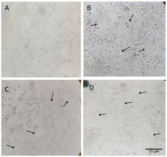 Cytopathic effects (CPEs) observed in MDCK (CCL-34) cell cultures after inoculation with Influenza A virus-positive samples from swine rectal swabs; MDCK CCL34 cells (Madin–Darby canine kidney). Black arrows highlight the cytopathic effects caused by influenza A, observed 72 h after inoculation. (A) Cell control inoculated with DMEM; (B) 7th inoculum of the rectal swab sample from a sow at 90 days of gestation; (C) 6th inoculum of the rectal swab sample from a 35-day-old piglet; (D) 6th inoculum of the rectal swab sample from a 130-day-old finishing pig. Magnification: 500×.