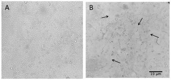 Cytopathic effects (CPEs) observed in MDCK (CCL-34) cell cultures after inoculation with Influenza A virus-positive samples from swine and environmental sources. Black arrows highlight the cytopathic effects caused by viral influenza infection. (A) Cell control inoculated with DMEM; (B) 6th inoculum of the effluent sample from the 150-day-old finishing barn. Magnification: 500×.