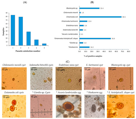 Microscopic parasite identification. (A) Samples with multiple parasites identified through coproparasitological microscopy. (B) Parasitic entities detected in stool samples using coproparasitological methods. (C) Photographs of cysts and eggs with magnification objective of parasite entities of stool samples preserved with SAF visualized in montage with Lugol’s iodine staining. Image J (v. 1.54 g) was used to calibrate the photographs. * Pathogenic parasites are marked with an asterisk.