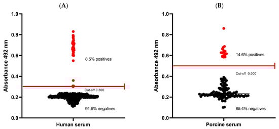 Briefly, human and porcine serum samples were diluted 1:100 in phosphate-buffered saline (PBS) and incubated overnight at 4 °C with the antigen. The samples were then washed with PBS-Tween 20 (0.1%), and the wells were blocked with 0.1% bovine serum albumin (fraction V, SIGMA, St. Louis, MO, USA). The reaction was developed using a peroxidase-conjugated secondary antibody—anti-human or anti-pig IgG—at dilutions of 1:2500 and 1:5000, respectively. Absorbance values were measured at 492 nm using a Multi-Skan Plus MK-II ELISA reader.