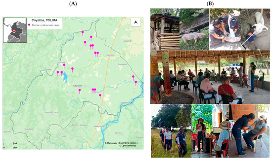 Seropositivity distribution of porcine cysticercosis and photographs of the intervention in Coyaima. (A) Map of seropositive porcine samples for cysticercosis cases (https://online.mapcreator.io/ (accessed on 20 March 2025)). (B) Photographs of the intervention activities within the Coyaima community and pigs, taken by field staff.