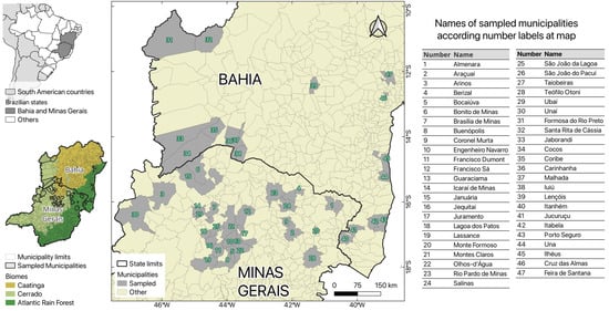 Map with studied areas, in Brazilian states Bahia and Minas Gerais, with their spatial relationship to the biomes.