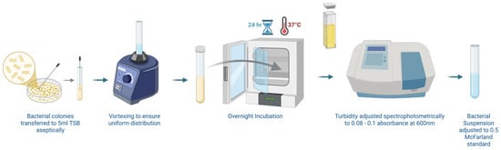 Overnight cultures were vortex-mixed; optical density was read at 600 nm and adjusted to 0.08–0.13 (≈1 × 108 CFU mL−1, 0.5 McFarland standard) with sterile TSB. These suspensions were used immediately for all antimicrobial assays (Figure 1).