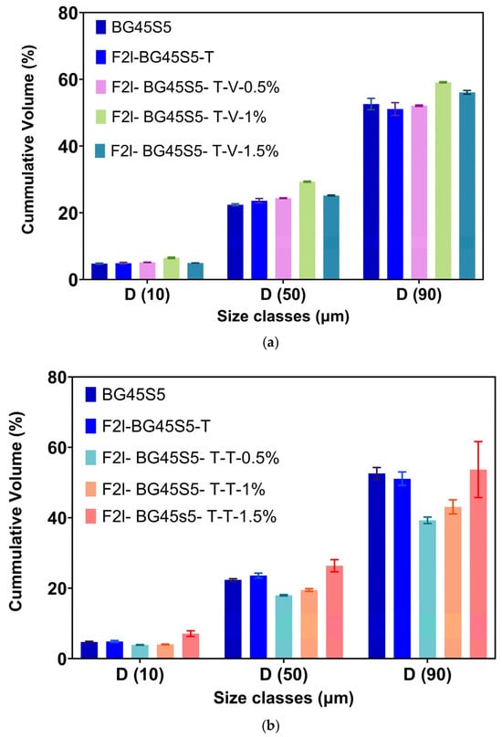 (a). Cumulative-volume particle-size classes (D10, D50 and D90) of BG45S5 core and its trehalose-coated analogue (F2l-BG45S5-T) before and after vancomycin loading (0.5, 1.0 and 1.5% w/w) n = 3. One-way ANOVA with Šídák correction was applied to column means. Only the 1.0% (p < 0.0001) and 1.5% (p < 0.001) formulations differed significantly from the BG45S5 core; all other pairwise comparisons were not significant (ns). (b). Cumulative-volume particle-size classes (D10, D50 and D90) of BG45S5 core and its trehalose-coated analogue (F2l-BG45S5-T) before and after teicoplanin loading (0.5, 1.0 and 1.5% w/w) n = 3. Relative to BG45S5, the 0.5% and 1% teicoplanin formulations showed significant decreases (p < 0.0001) and (p < 0.001), whereas the 1.5% formulation was not different (ns). The coated blank (F2l-BG45S5-T) did not differ from BG45S5 (ns). When compared with the coated blank, increases were again observed for the 0.5% and 1% formulations (p < 0.0001) and a modest decrease for the 1.5% formulation (p < 0.05).