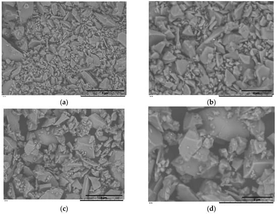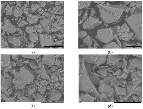 Figure 2a,b summarise the cumulative-volume classes (D10, D50 and D90) obtained for the uncoated BG45S5 core, the trehalose-coated blank (F2l-BG45S5-T), and the drug-loaded formulations. The trehalose layer alone produced only a marginal upward shift in D50. When 0.5% vancomycin was added, the distribution remained statistically indistinguishable from both BG45S5 and the coated blank. Loading at 1.0% enlarged D50 by ~5 µm and broadened the upper tail (significant change in D90), while 1.5% produced a smaller but still significant increase. D10 was unaffected in all cases, indicating that primary fines were not agglomerated by the coating or the drug. Teicoplanin-loaded formulations on the other hand were dose-dependent but opposite in direction. Incorporation of 0.5% and 1.0% teicoplanin reduced D50 by ≈6 µm and ≈4 µm, respectively, and narrowed the span between D50 and D90. The 1.5% loading restored the median size to the level of the trehalose blank and produced the broadest D90, suggesting partial aggregation or bridging at the highest concentration. These numerical trends are consistent with the surface morphology shown in the SEM micrograph, which confirms a smooth, consolidated surface morphology characteristic of non-porous, melt-quenched glass particles (Figure 3, Figure 4 and Figure 5).