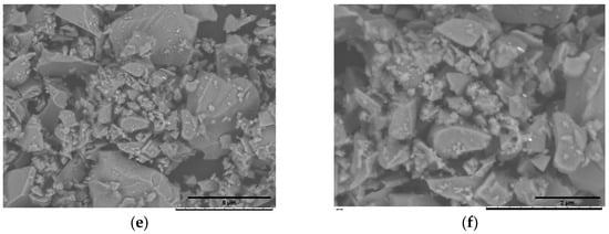 SEM of the vancomycin-loaded BG45S5 formulations. F2l-BG45S5-T-V-0.5% (a,b), F2l-BG45S5-T-V-1% (c,d), and F2l-BG45S5-T-V-1.5% (e,f). Images were recorded at nominal magnifications of 1.5 k× (a,c,e) and 3 k× (b,d,f).